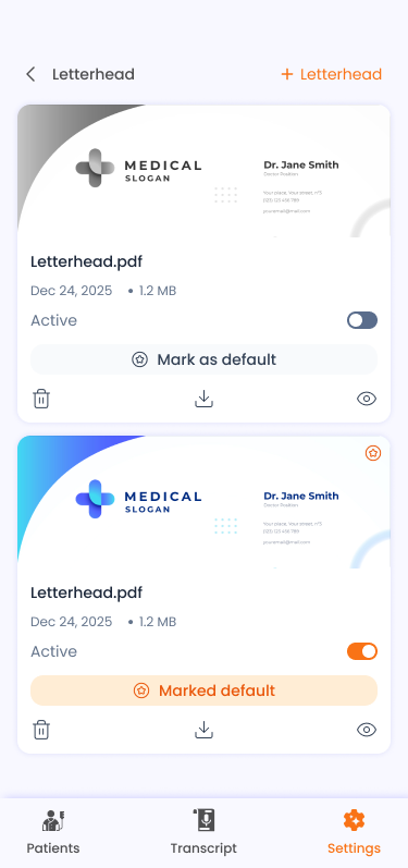 Tap Add Letterhead in the header to upload or create a new letterhead.