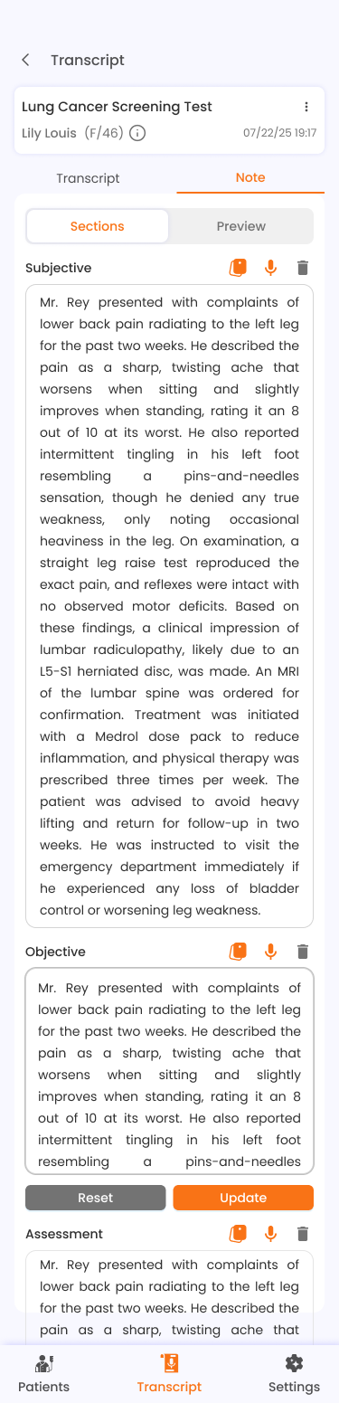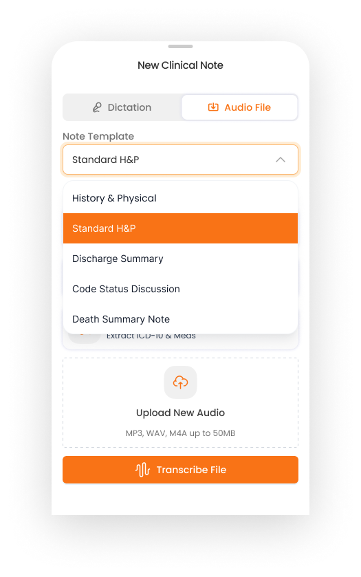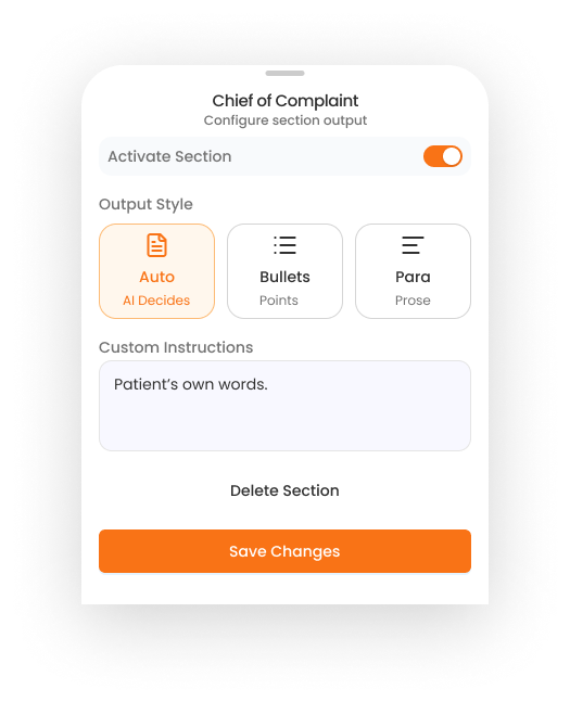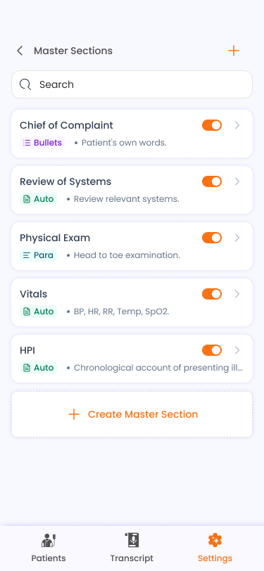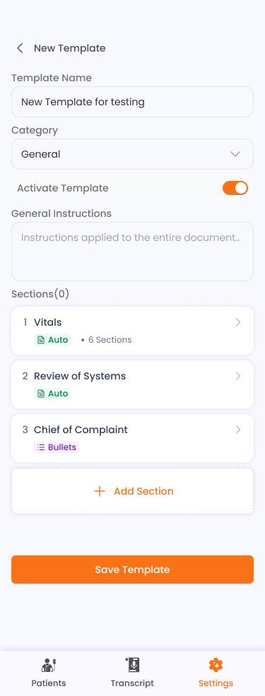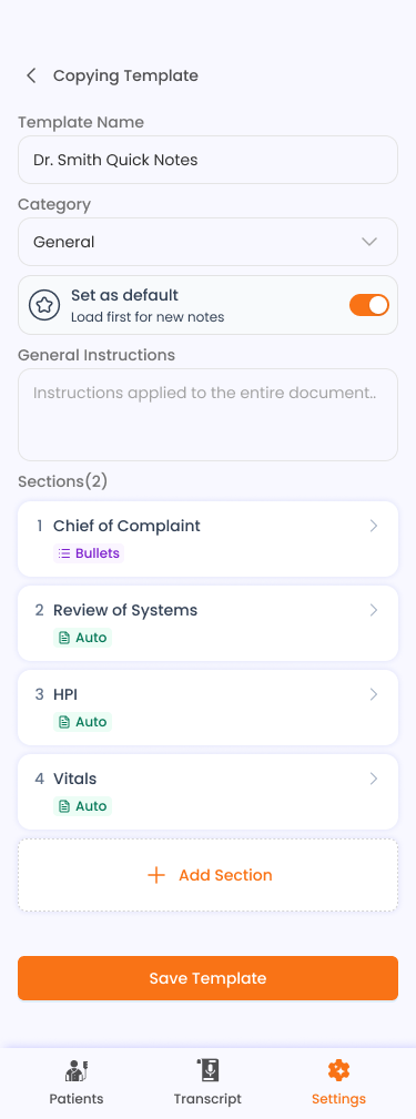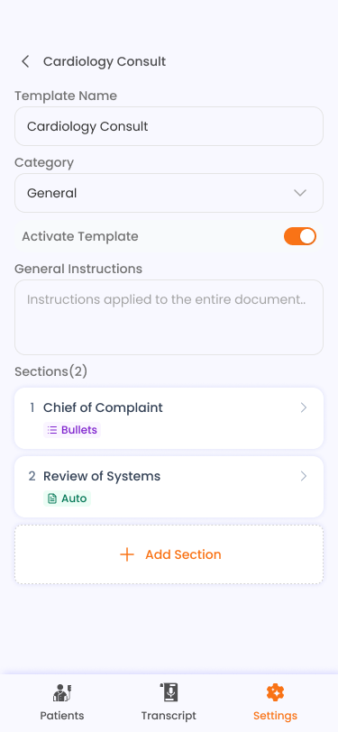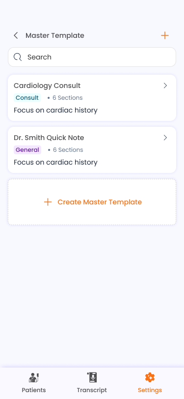 Templates define the structure and sections of your clinical notes. Access them from Settings > Note Templates.