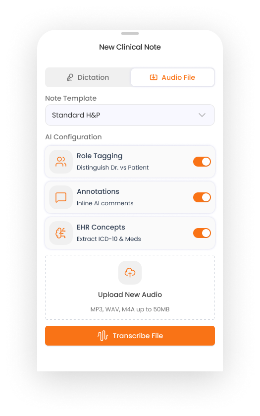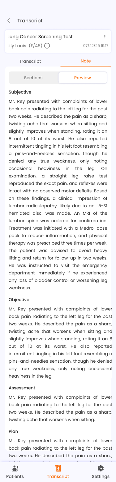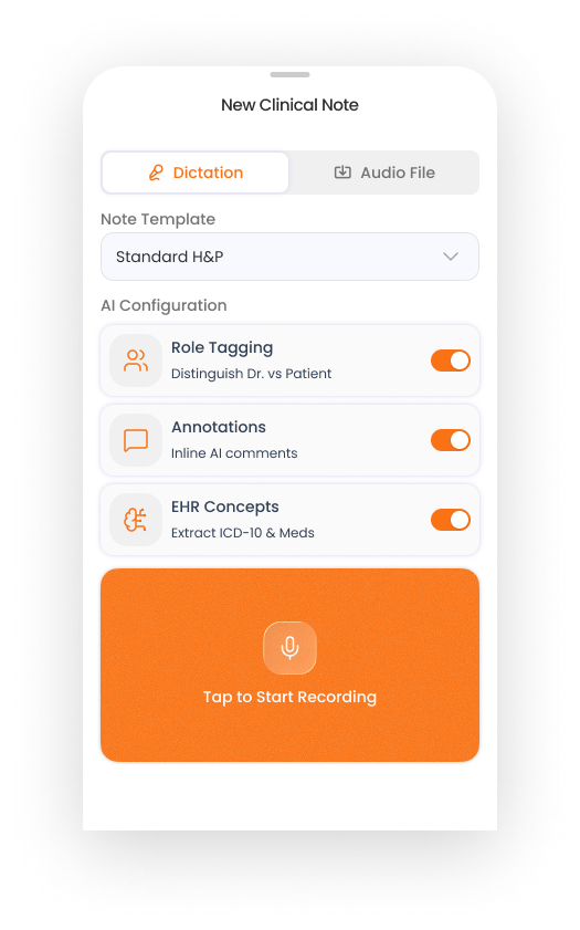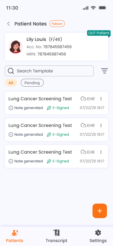 Falcon CliNote is an AI-powered clinical note-taking application for physicians. It converts voice dictation or uploaded audio into structured clinical notes, with support for EHR integration, e-signatures, and PDF export.