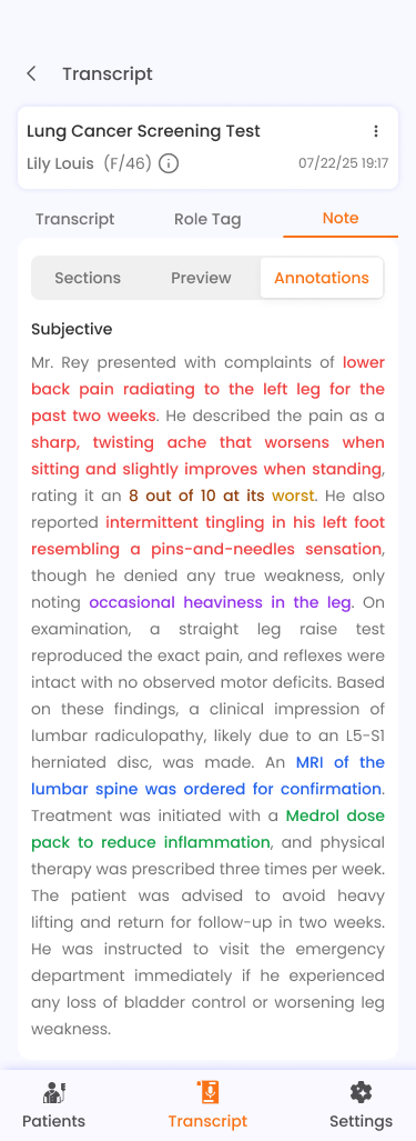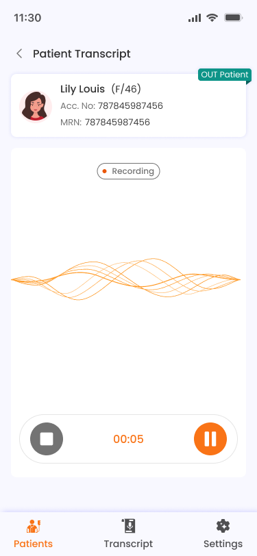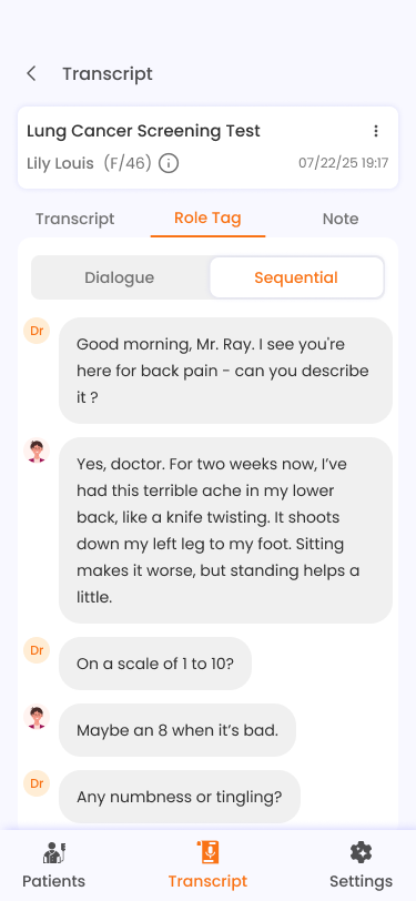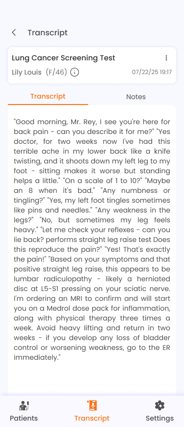 The Patients tab displays the list of patients you've added, with search and filter capabilities. Tap any patient to view their notes.