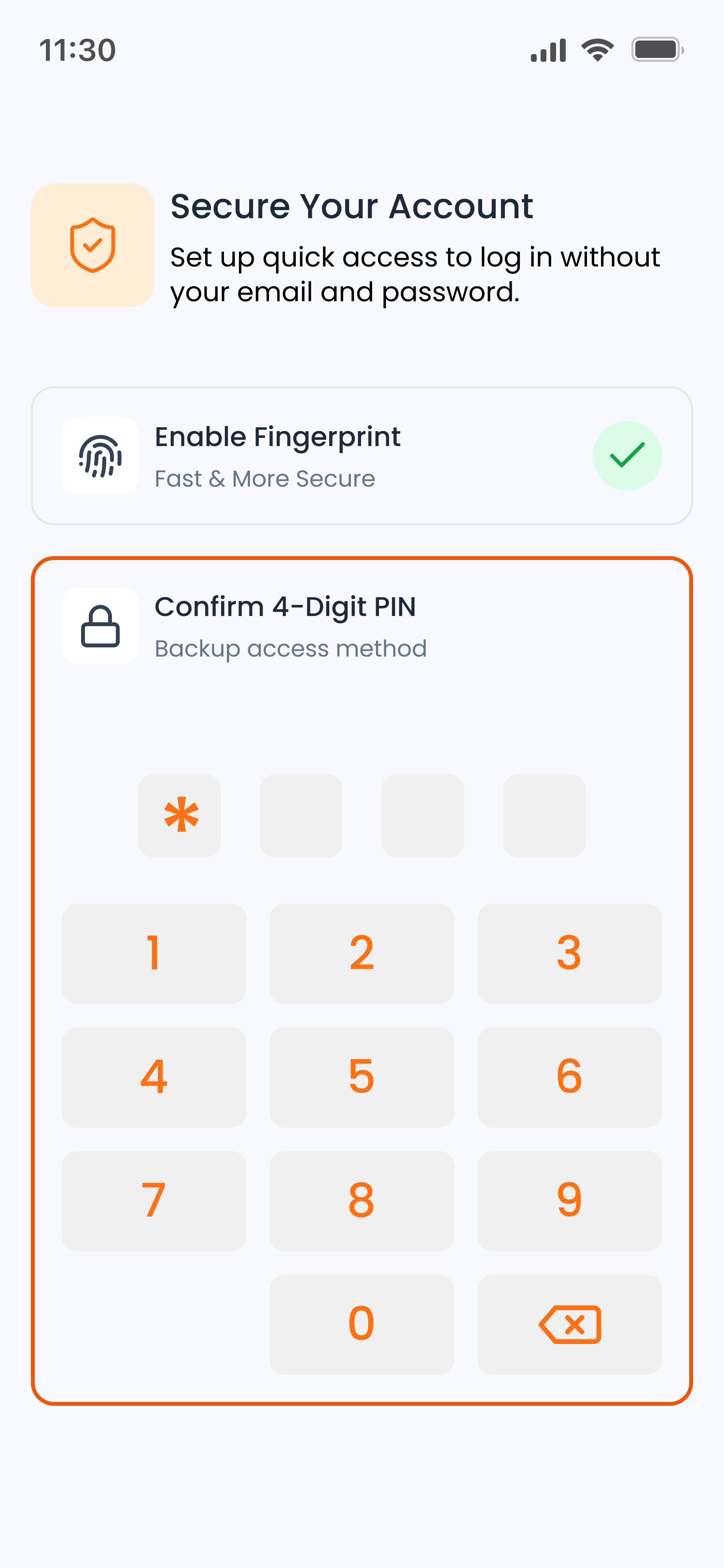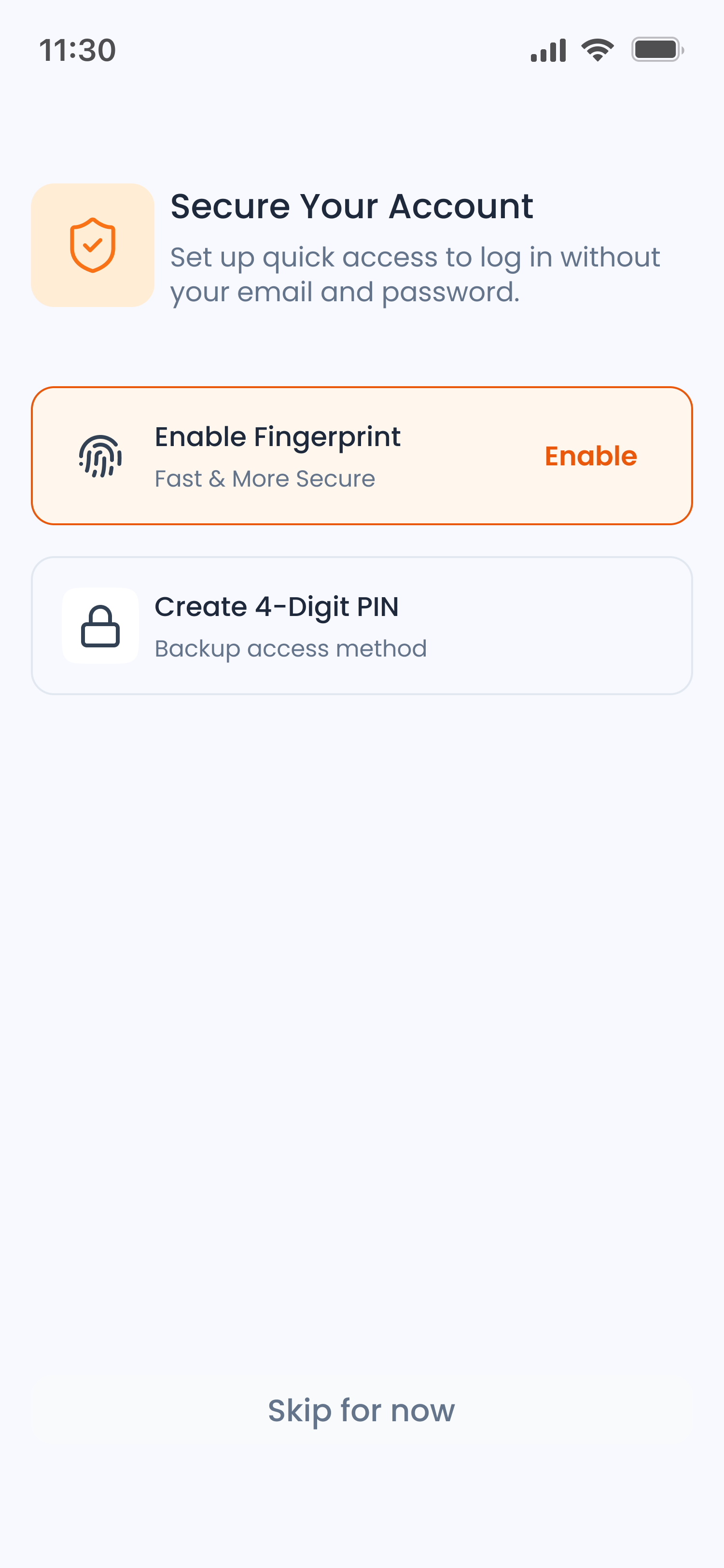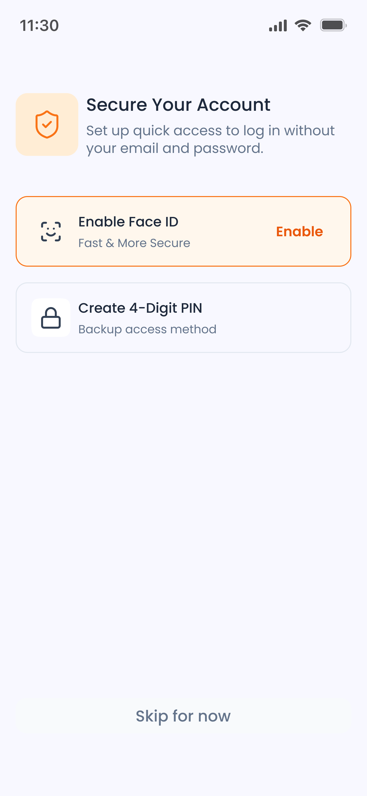 - Biometrics (Face ID / Fingerprint): If your device supports it, you can enable biometric authentication with a single tap.