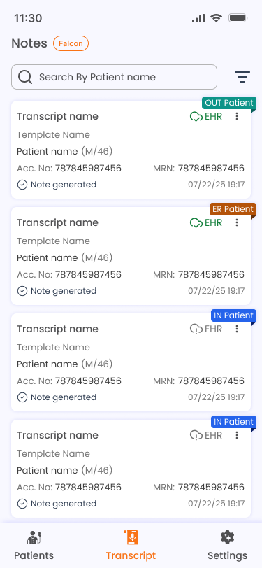 A mode badge ("Clinote" or "Falcon") appears in the header of the Patients and Transcript screens to indicate the active mode.
