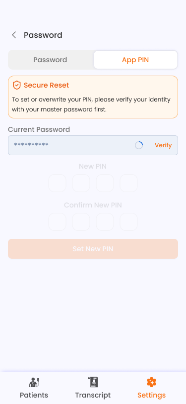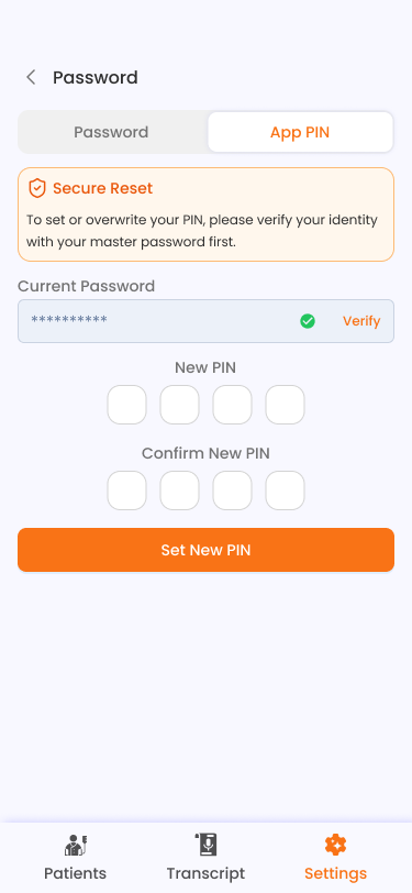 App PIN Tab: - First verify your current PIN by entering it and tapping Verify. - Once verified, enter and confirm your new 4-digit PIN. - Tap Set New PIN to save.