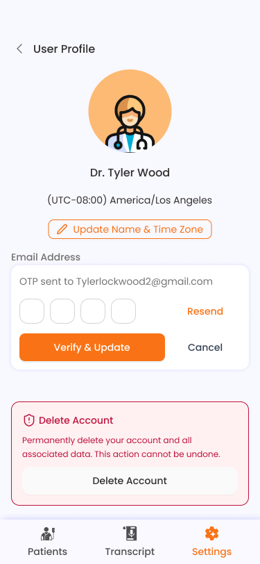 - Change Email: Enter a new email address. A verification OTP will be sent to confirm the change.