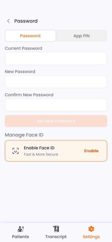 Password Tab: - Enter your current password, then your new password and confirmation. - Tap Set New Password to save. - Below the password section, you can enable or disable biometric authentication (Face ID / Fingerprint).