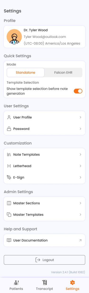 Falcon CliNote supports two operating modes, switchable from the Quick Settings section in Settings:
