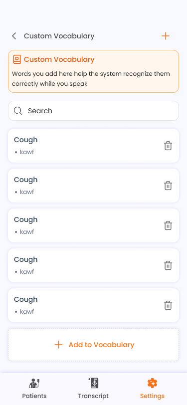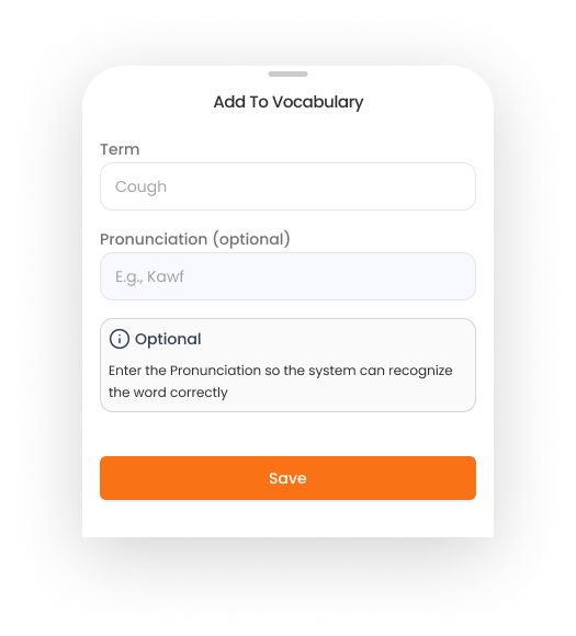 Custom vocabulary helps the AI speech recognition system correctly identify specialized medical terms, proper nouns, or uncommon words.