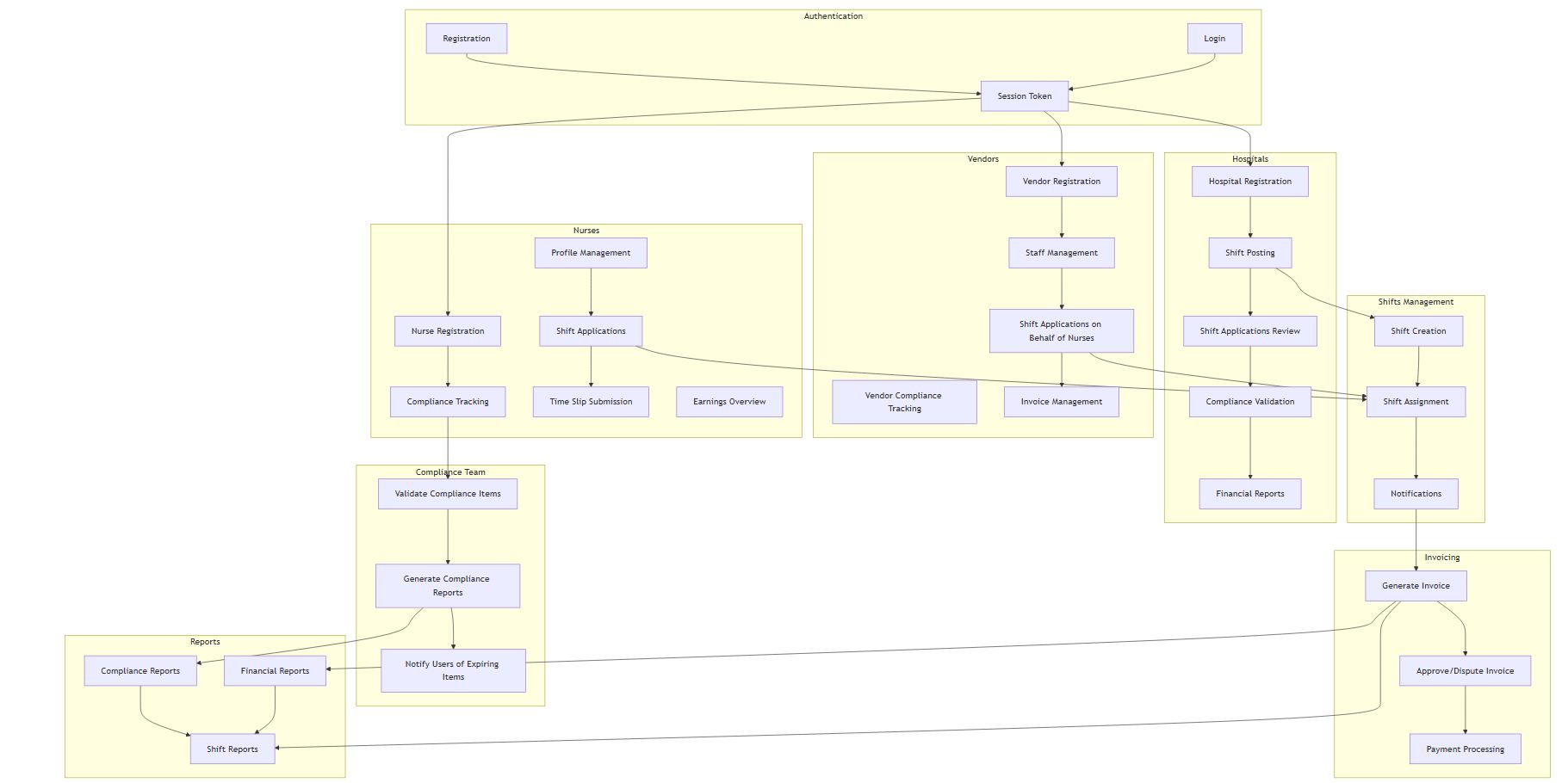 - Purpose: Manage staffing on behalf of nurses and interact with hospitals for shift fulfillment.