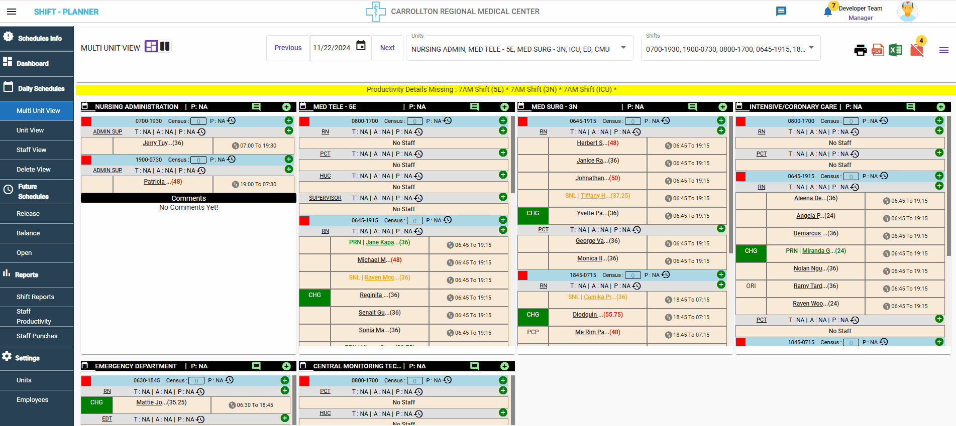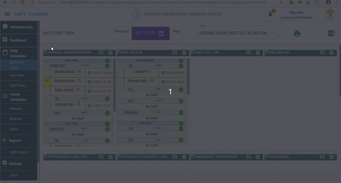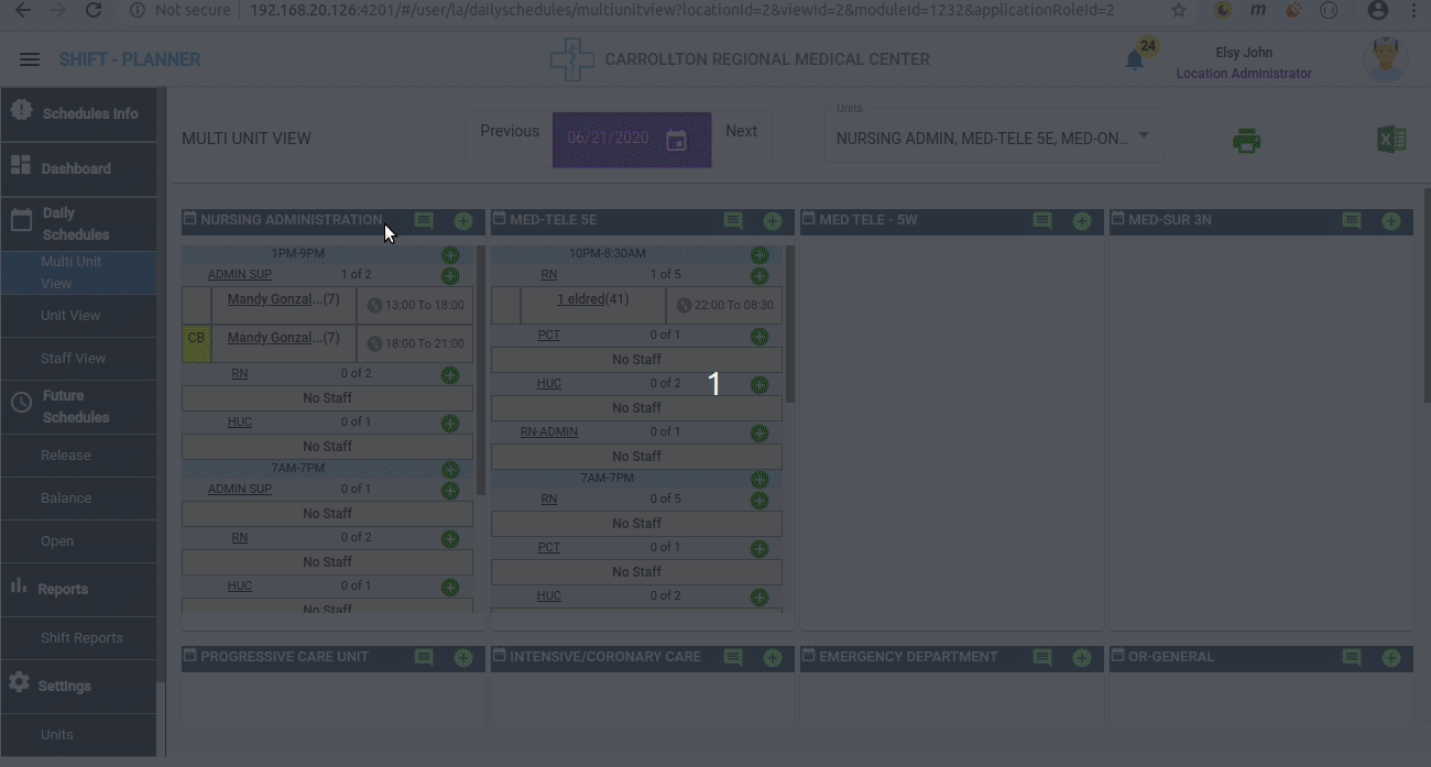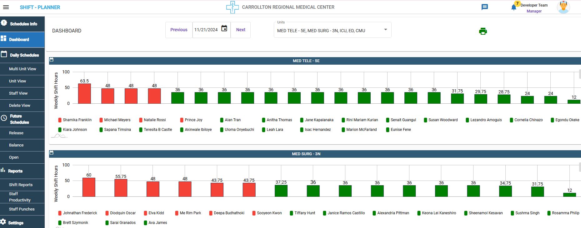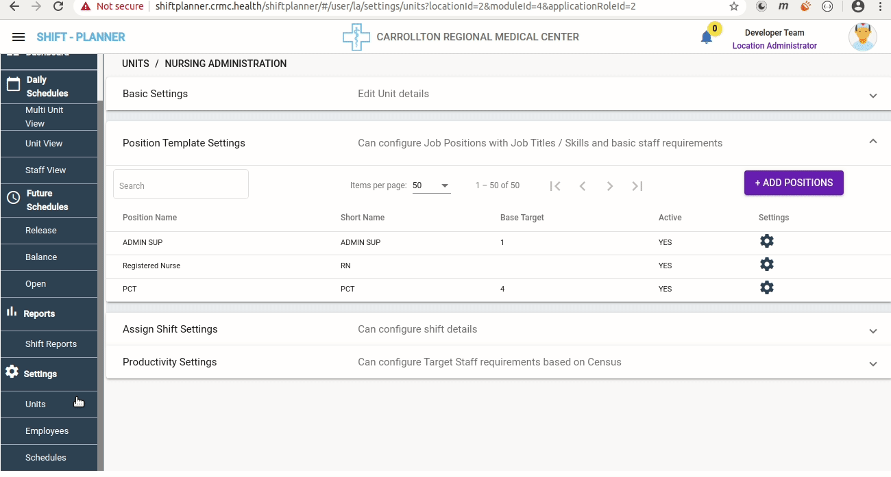 - Managers/Admins configure the required staff count for each Unit/Shift/Position in the Settings Page.