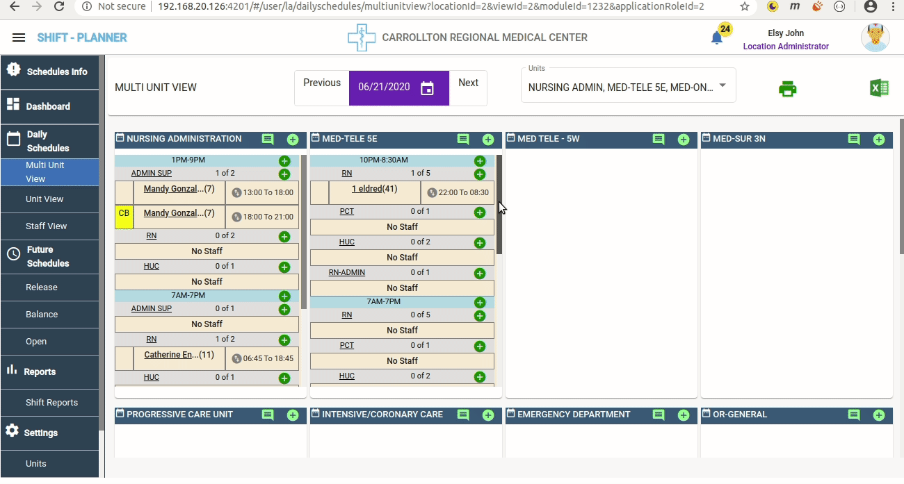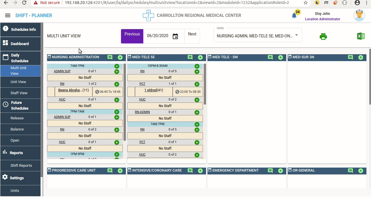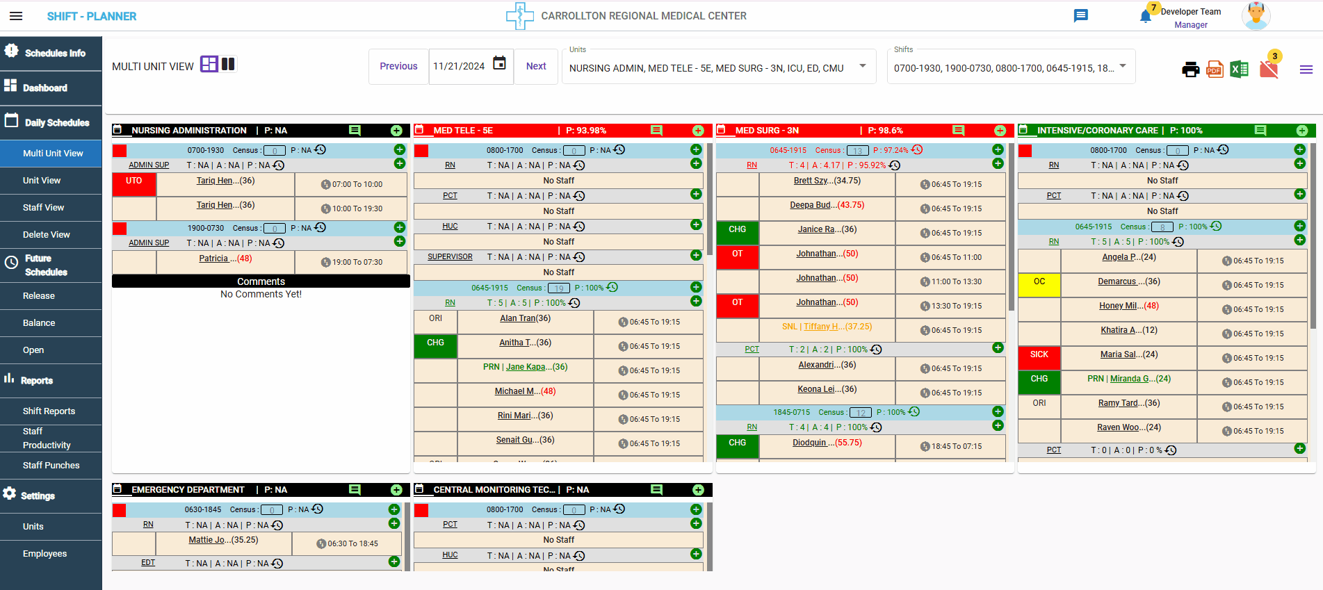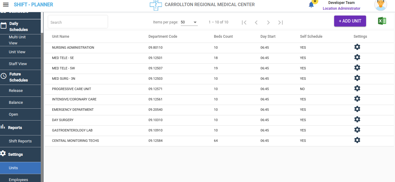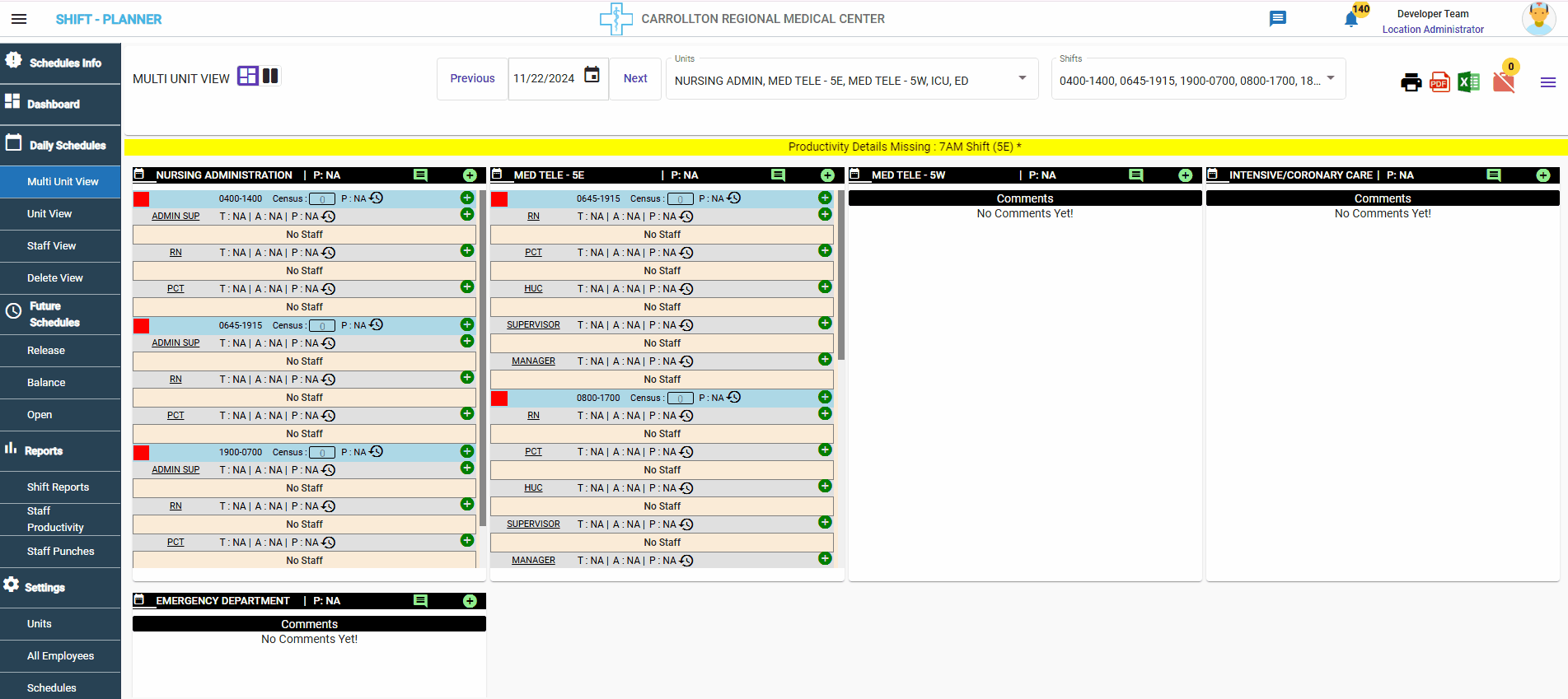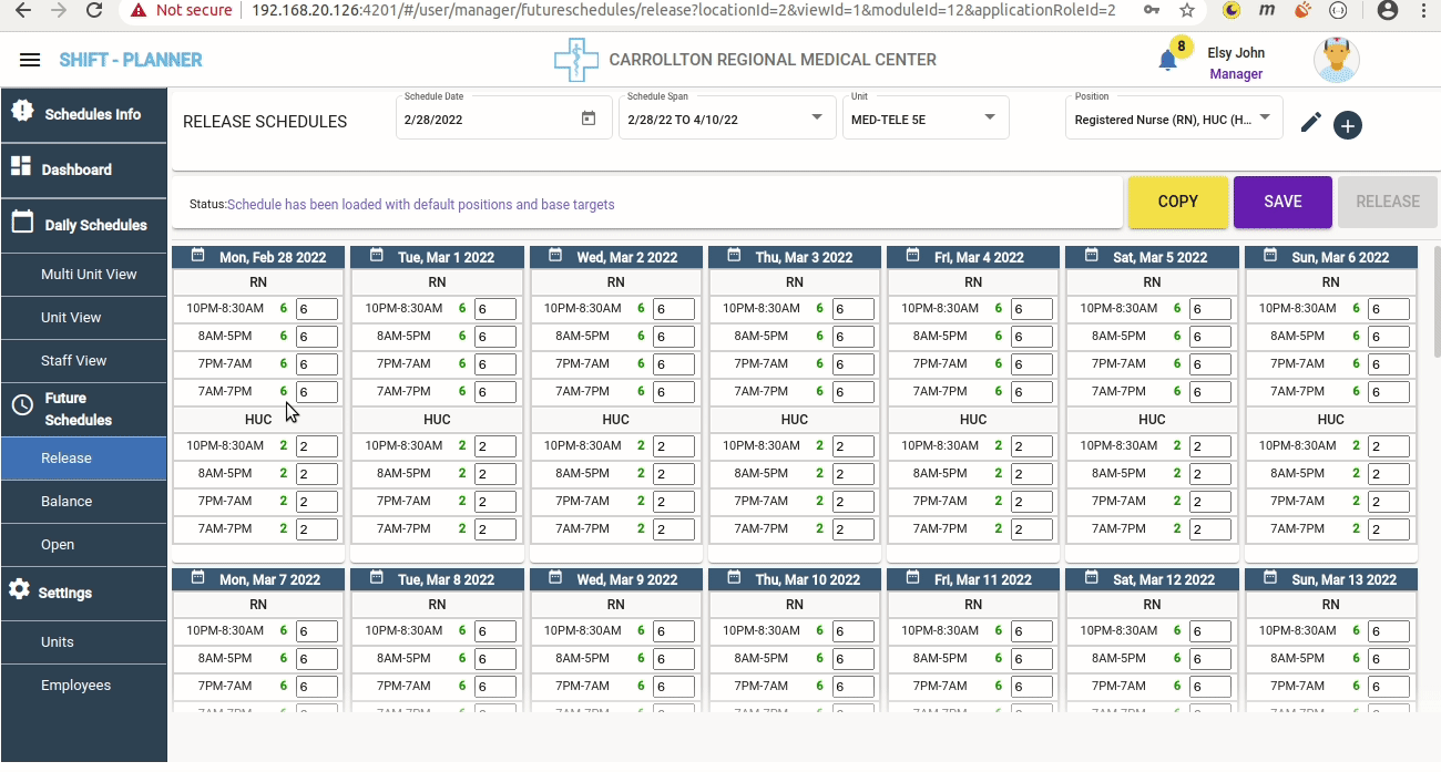 - Managers/Admins configure the required staff count for each Unit/Shift/Position in the Settings Page.