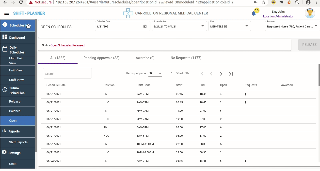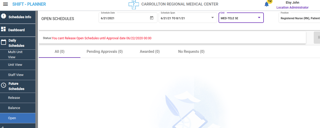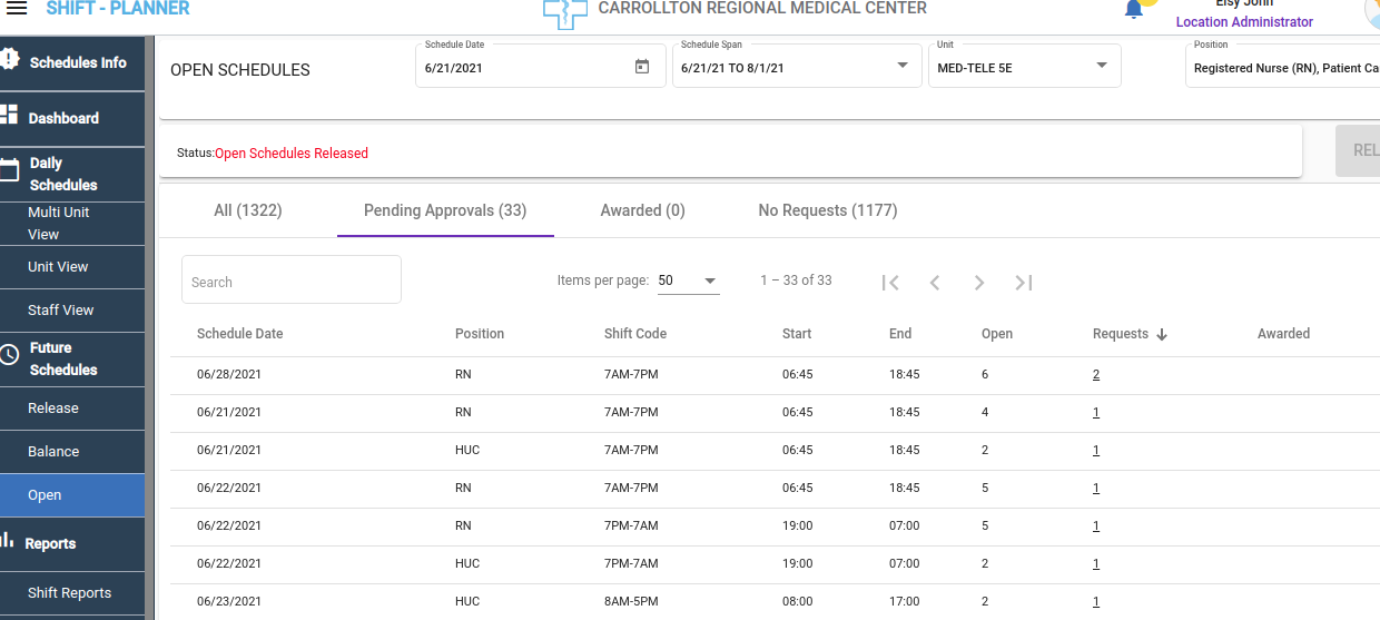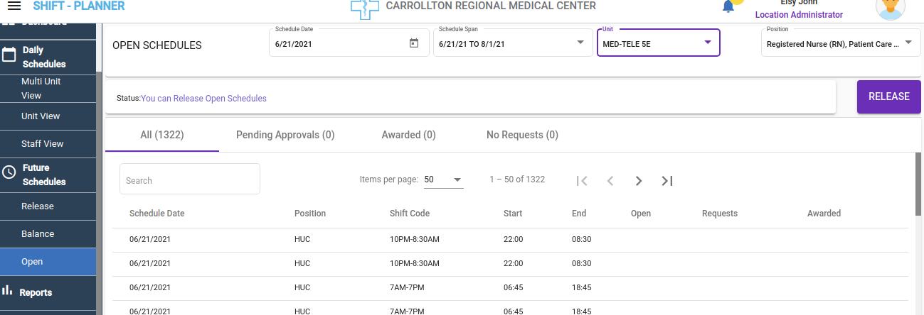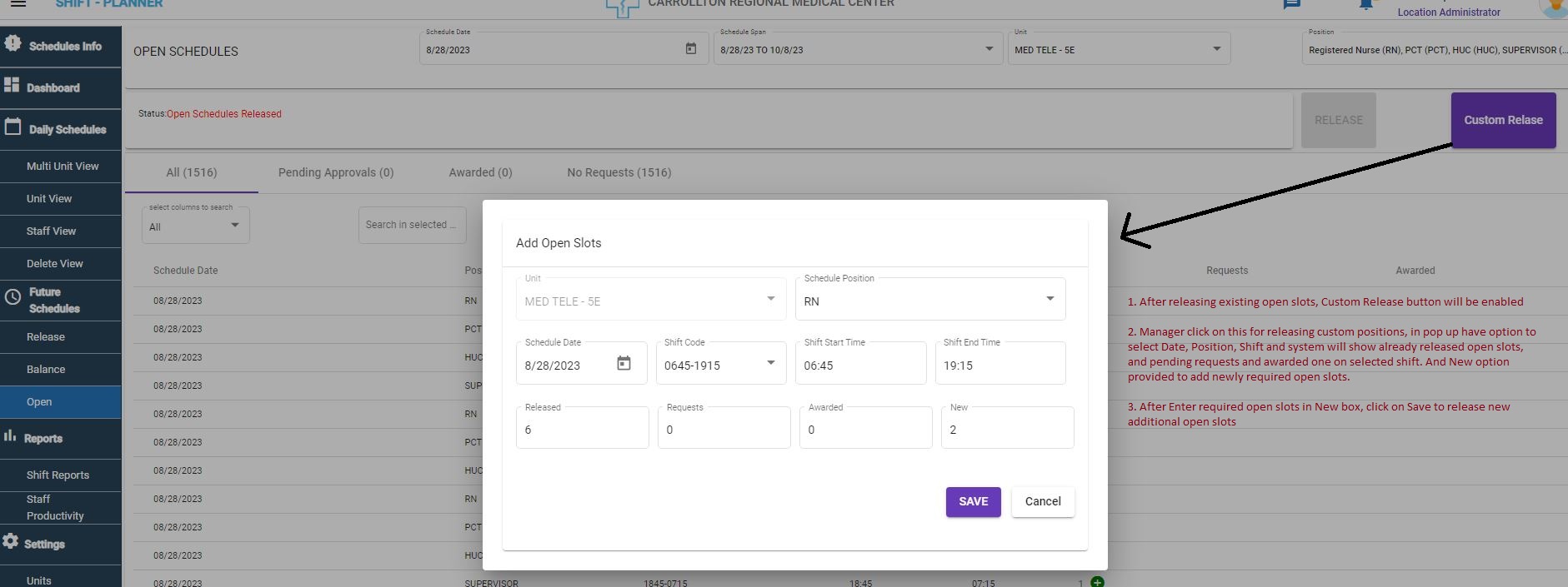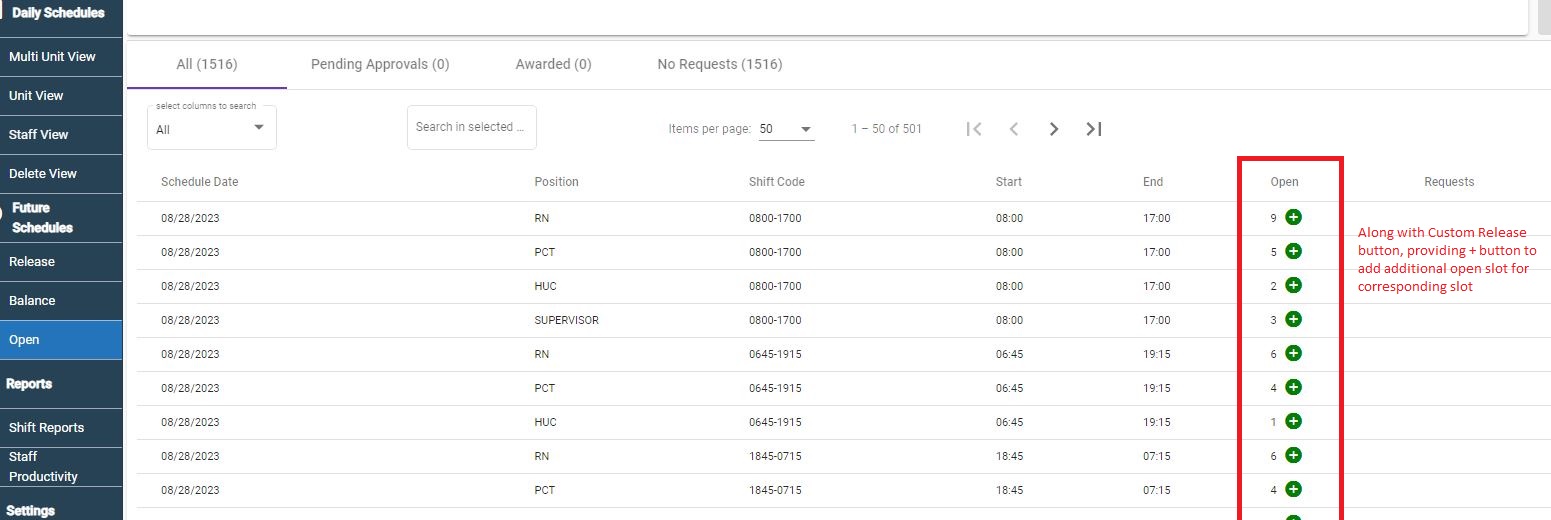 After the approval of Balance Schedules, Managers can release the remaining open shifts that were not opted for or approved in self-schedules. These open shifts are made available for staff to request.
