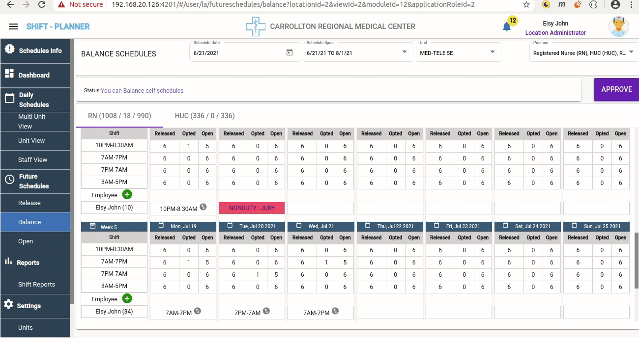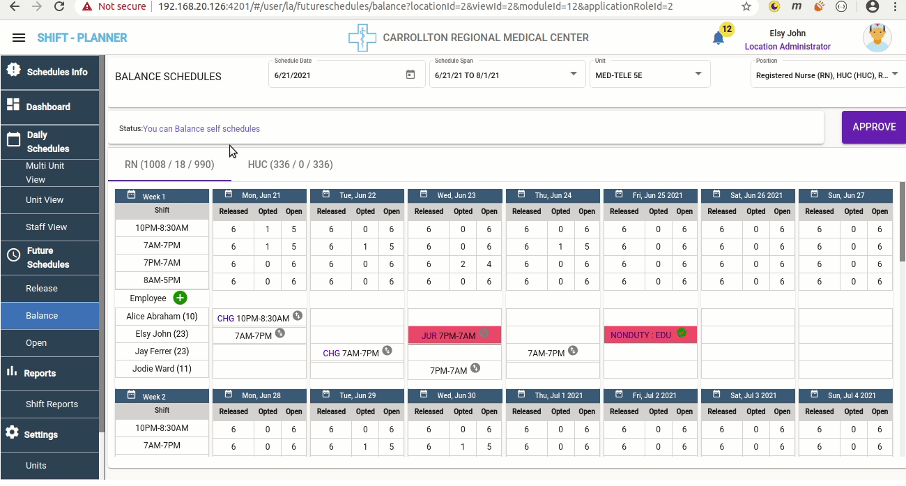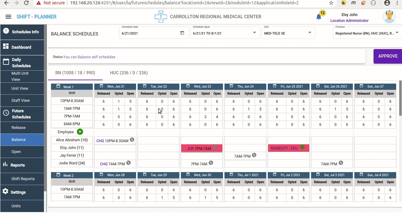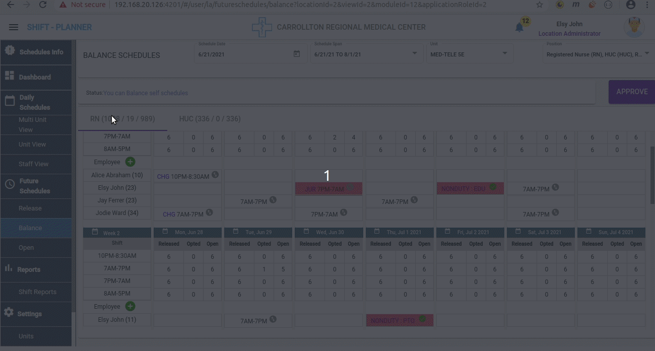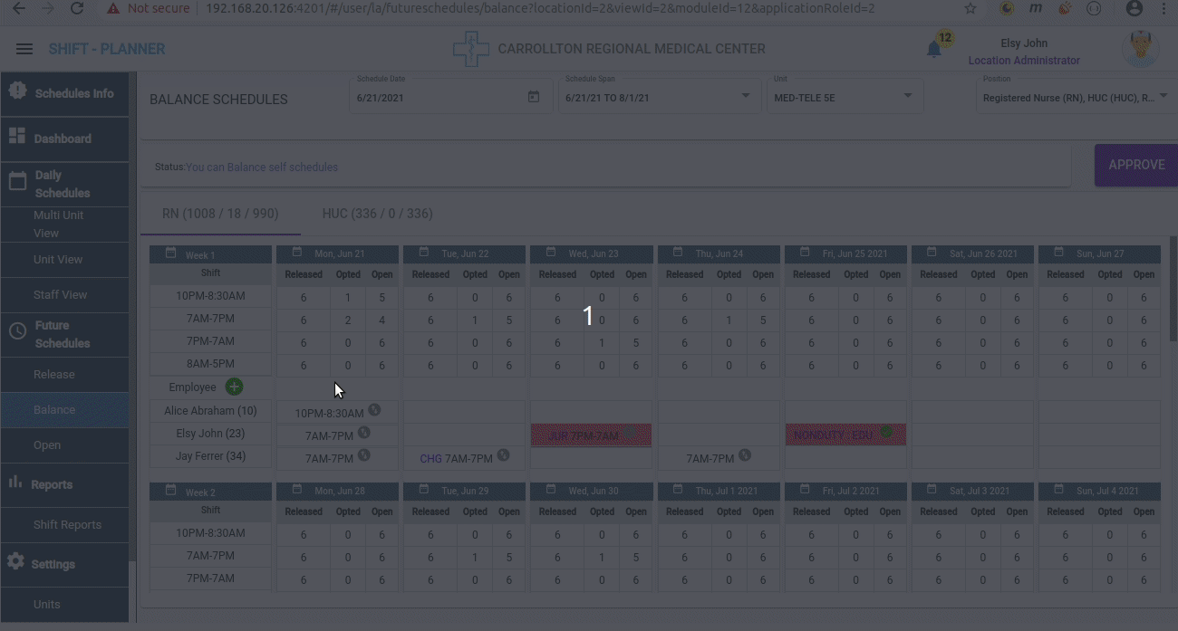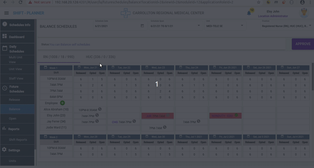 To balance and approve self-schedules applied by staff, click on the Balance menu under Future Schedules.