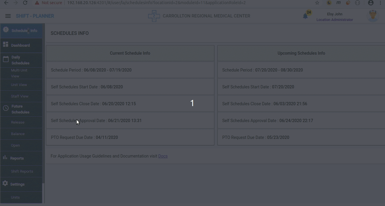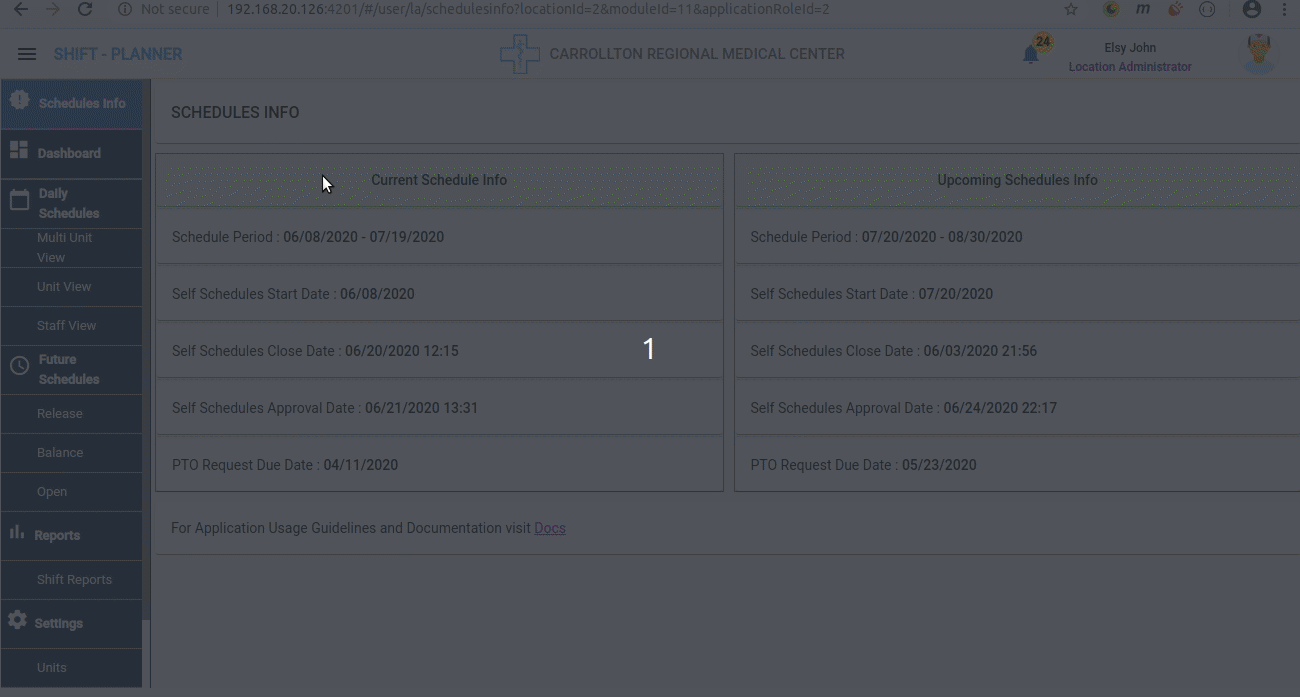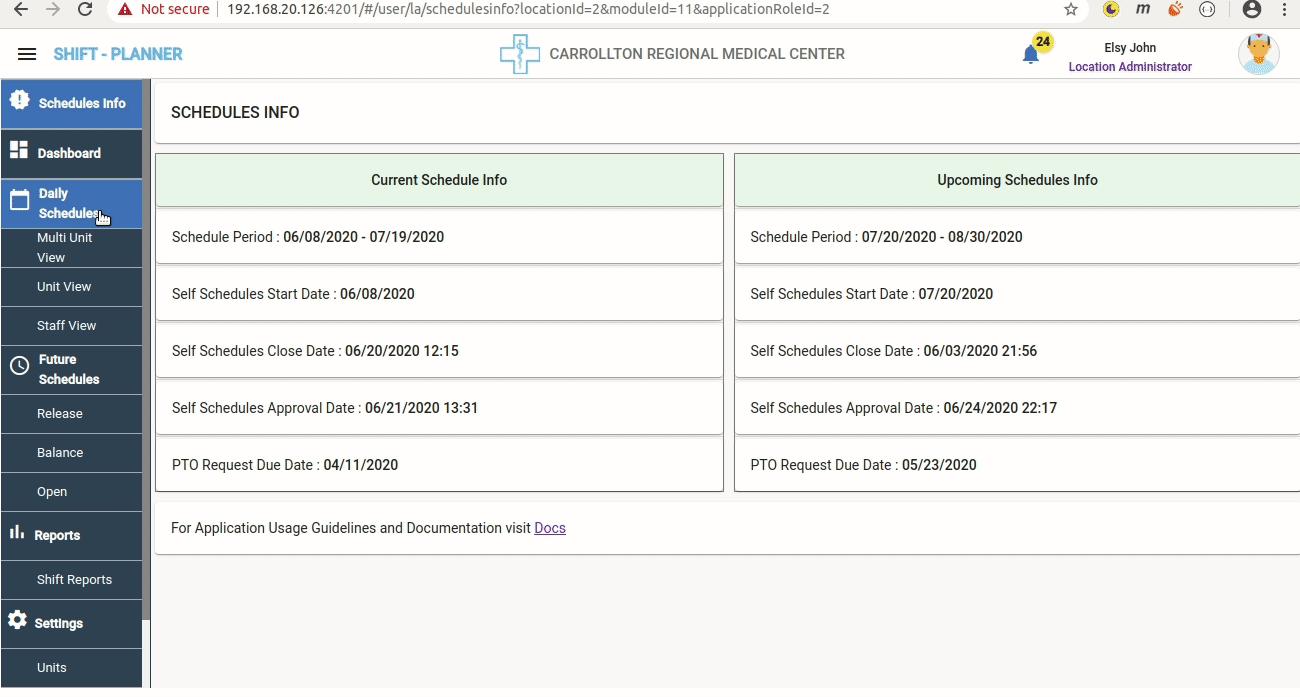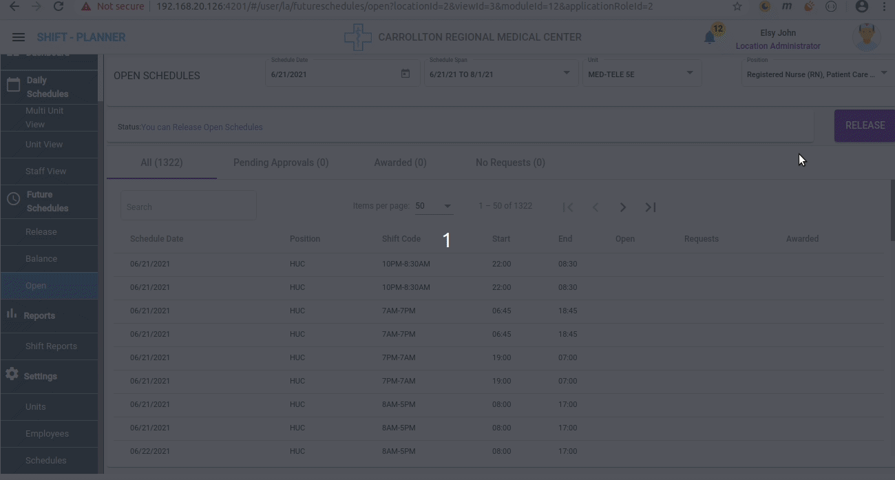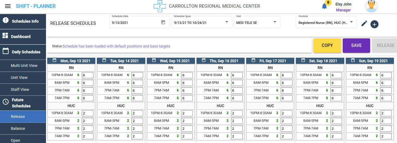 - Once schedules are released, staff can apply for self-schedules for up to 2 weeks (this duration is configurable).