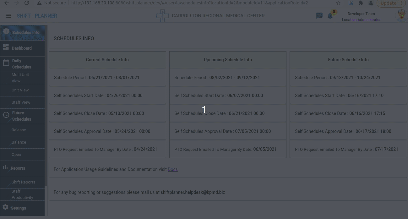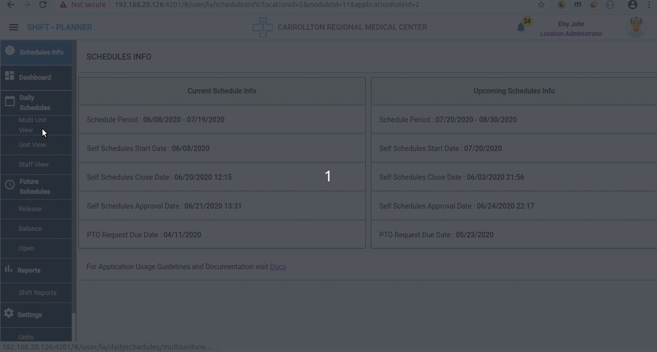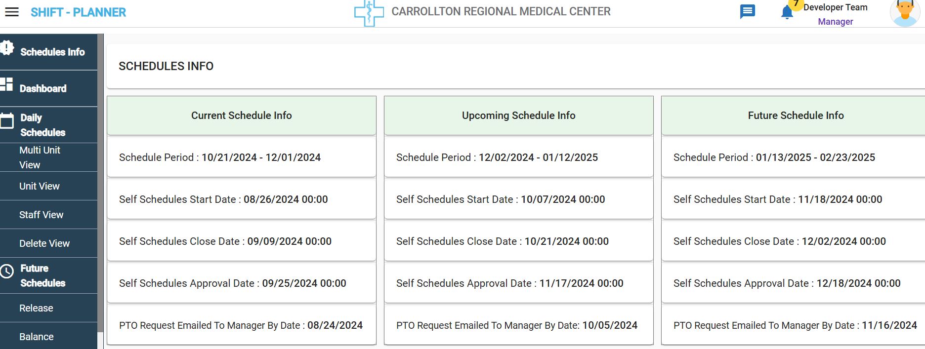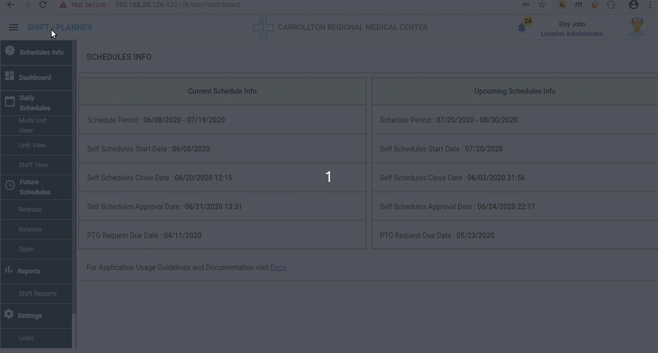 - Once schedules are released, staff can apply for self-schedules for up to 2 weeks (this duration is configurable).