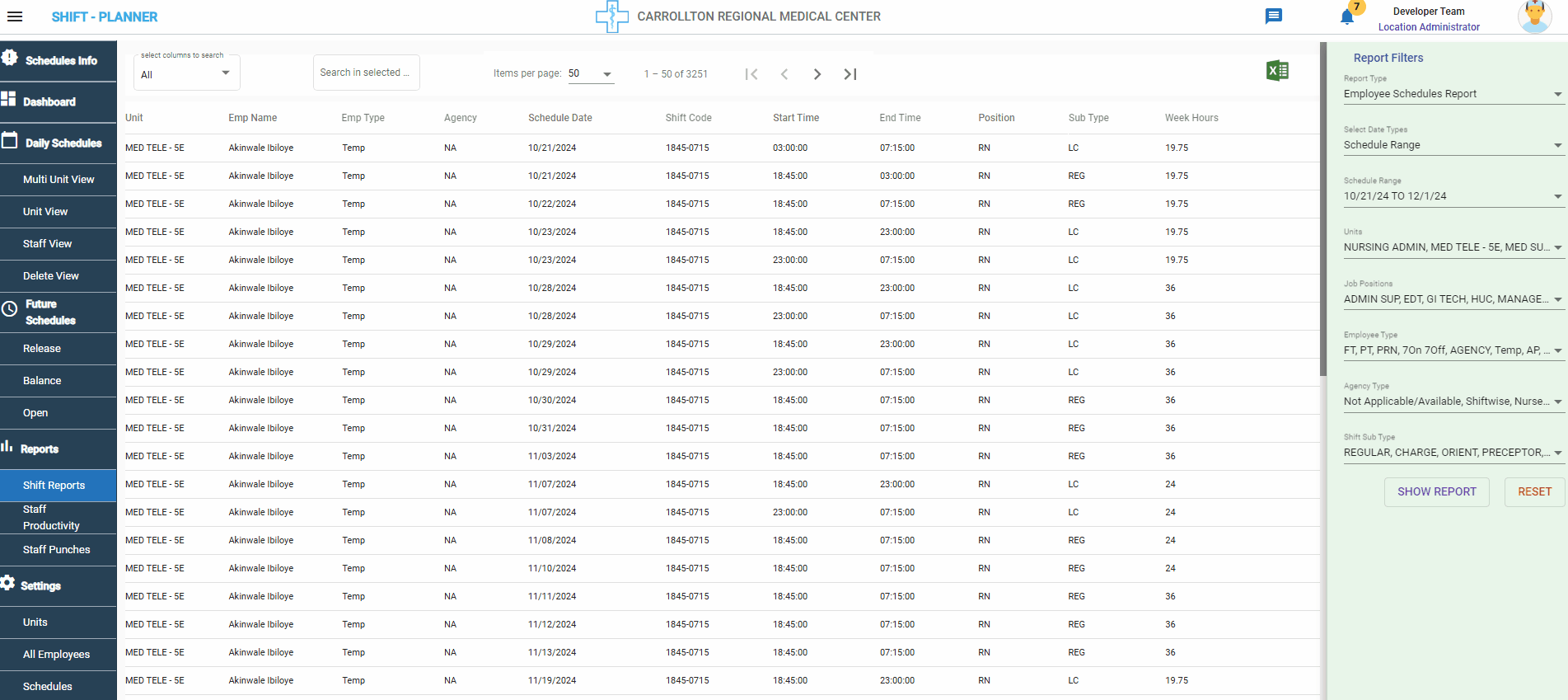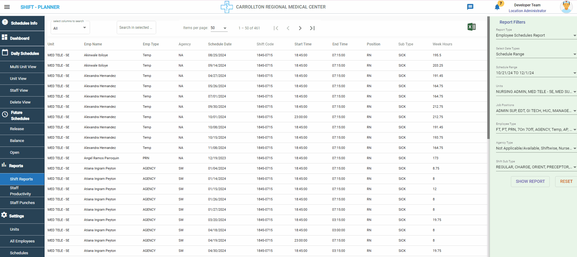 Shift reports can be used to run reports for any subtypes and for any duration of time. For example if you want to run sick call report for your department for the past year you can use the custom dates and the filters as shown in the video.
